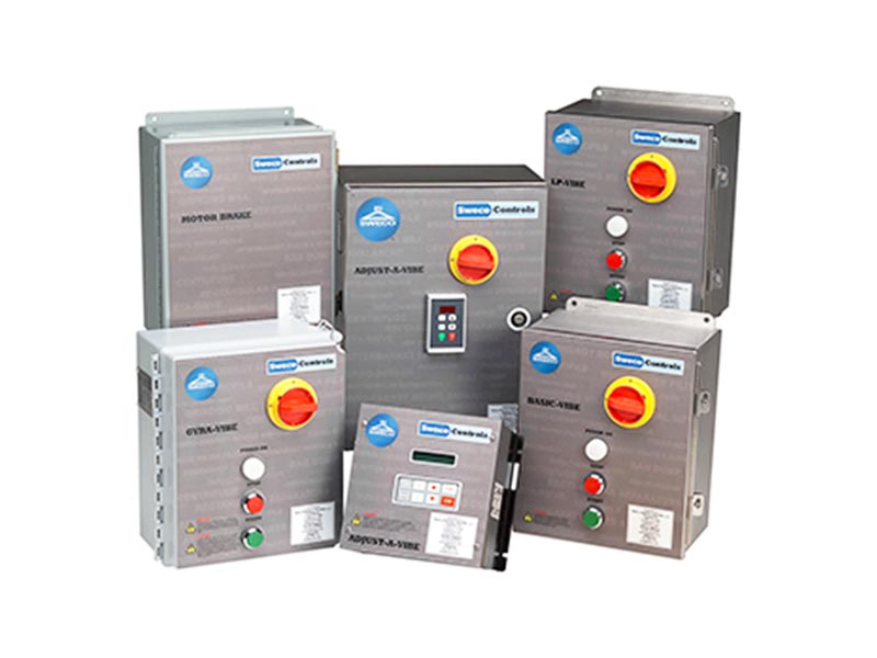 Adjust-A-Vibe is a start/stop inverter control with variable speed and variable output power for units with single motors from 1/4 HP to 5 HP. It is available in NEMA 4X painted steel and NEMA 4X stainless steel.