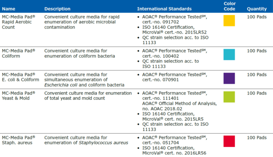 The MC-Media Pad® is designed for convenient and rapid routine testing of microbial contaminations in your food and beverage products. The pads are coated with a growth medium and chromogenic substrate for specific detection allowing faster results and improved readout. When the sample is applied, the liquid spreads evenly on the pad by capillary action. No additional working steps are required, improving the workflow and reducing the risk of contamination. It also can be used for environmental testing ie. direct stamping, air sampling and membrane filtrations.