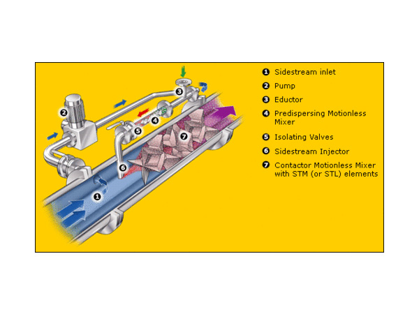 The Statiflo GDS is designed to overcome the difficulties associated with the use of a single static mixer. The system uses two different mixers, the first, in a sidestream, to form small gas bubbles and the second, in the main line to provide contact time and efficient mass transfer. As the gas bubbles are formed in a constant velocity sidestream, the gas bubble size is constant and independent of any variations in the main liquid flow.