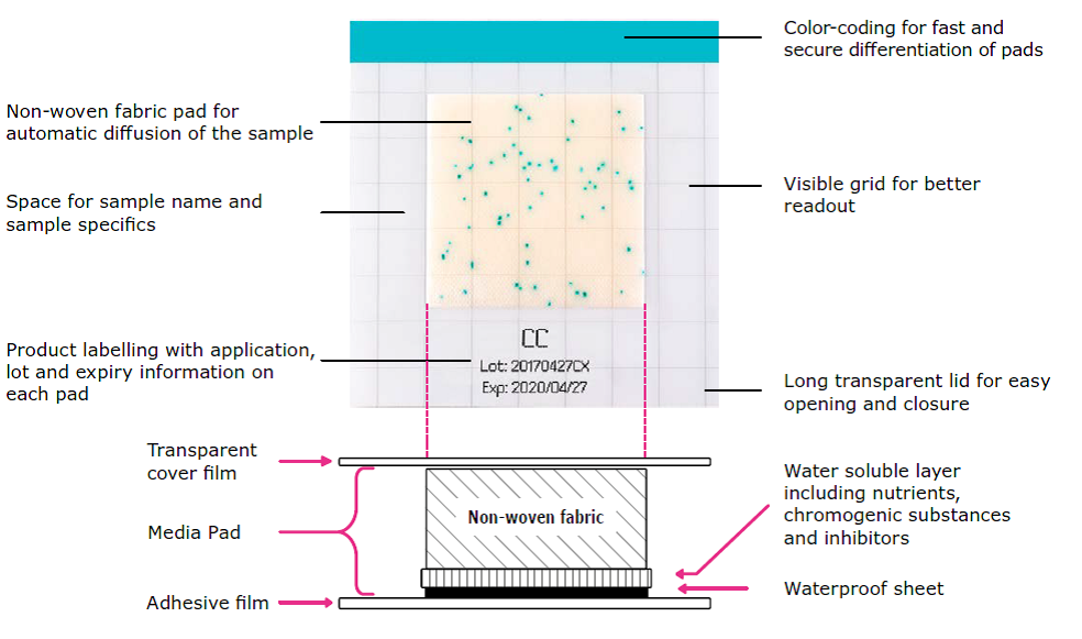 The MC-Media Pad® is designed for convenient and rapid routine testing of microbial contaminations in your food and beverage products. The pads are coated with a growth medium and chromogenic substrate for specific detection allowing faster results and improved readout. When the sample is applied, the liquid spreads evenly on the pad by capillary action. No additional working steps are required, improving the workflow and reducing the risk of contamination. It also can be used for environmental testing i.e. direct stamping, air sampling and membrane filtrations.