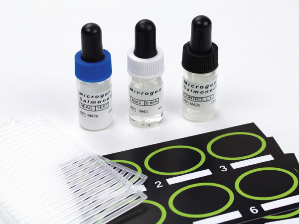 Microgen® Salmonella is a rapid latex slide agglutination test for the confirmatory identification of presumptive Salmonella colonies from selective agar plates.