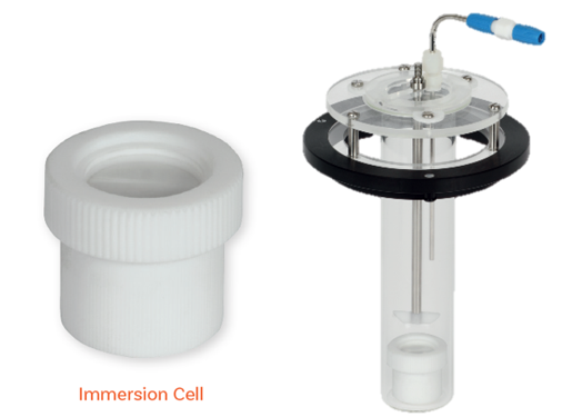 The immersion cell us used with a special flat-bottomed version of the 200 mL Small Volume Conversion Kit to eradicate the issue of dead space under the cell that would occur with a round bottomed vessel.
