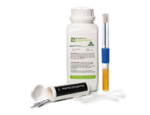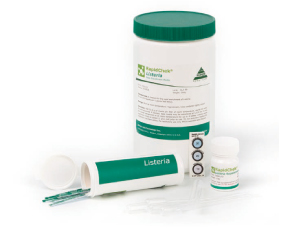 The RapidChek® Listeria monocytogenes method is designed to detect Listeria monocytogenes on environmental surfaces and a variety of food matrices. The test kit permits the presumptive detection and identification of the target pathogen by a one step enrichment in 44 – 48 hours.