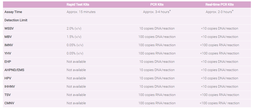 An accurate and ready-to-use PCR kit designed for detection of shrimp diseases. The kit contains all necessary enzyme components and primer sets for specific disease genome amplification by PCR assay within 3 hours.